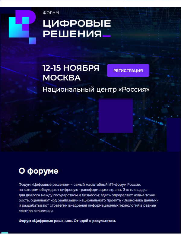 С 12 по 15 ноября 2025 года в Национальном центре "Россия" проходит самый масштабный ИТ-форум России "Цифровые решения", на котором обсуждают цифровую трансформацию страны. Это площадка для диалога между государством и бизнесом: здесь определяют новые точки роста, оценивают ход реализации национального проекта «Экономика данных» и разрабатывают стратегии внедрения информационных технологий в разные сектора экономики.